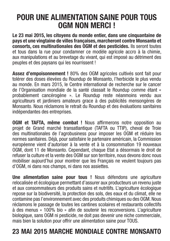 Le 23 mai 2015, les citoyens du monde entier, dans une cinquantaine de pays et une vingtaine de villes françaises, marcheront contre Monsanto et consorts, ces multinationales des OGM et des pesticides. Ils seront toutes et tous dans la rue pour condamner ce modèle agricole accro à la chimie, aux manipulations et au brevetage du vivant, qui est imposé au détriment des peuples et des paysans qui les nourrissent !